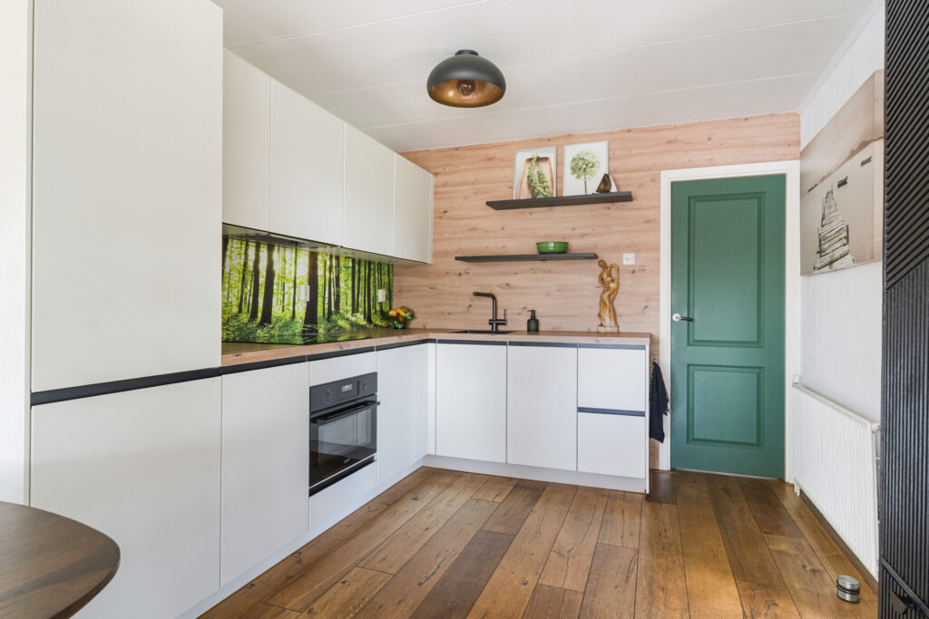 De open keuken sluit perfect aan op de woonkamer en is in 2021 volledig vernieuwd. De keuken is uitgerust met diverse inbouwapparatuur, waaronder een koelkast-vriescombinatie, vaatwasser, inductiekookplaat met afzuigkap en een combi oven. De opstelling maakt deze ruimte ideaal voor zowel dagelijks gebruik als het ontvangen van gasten.