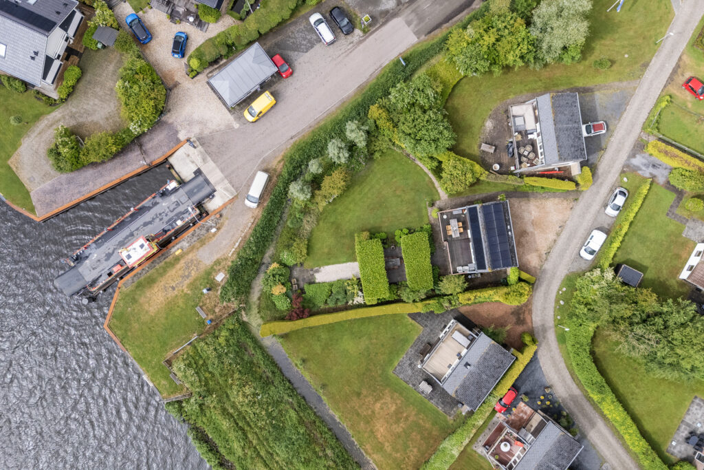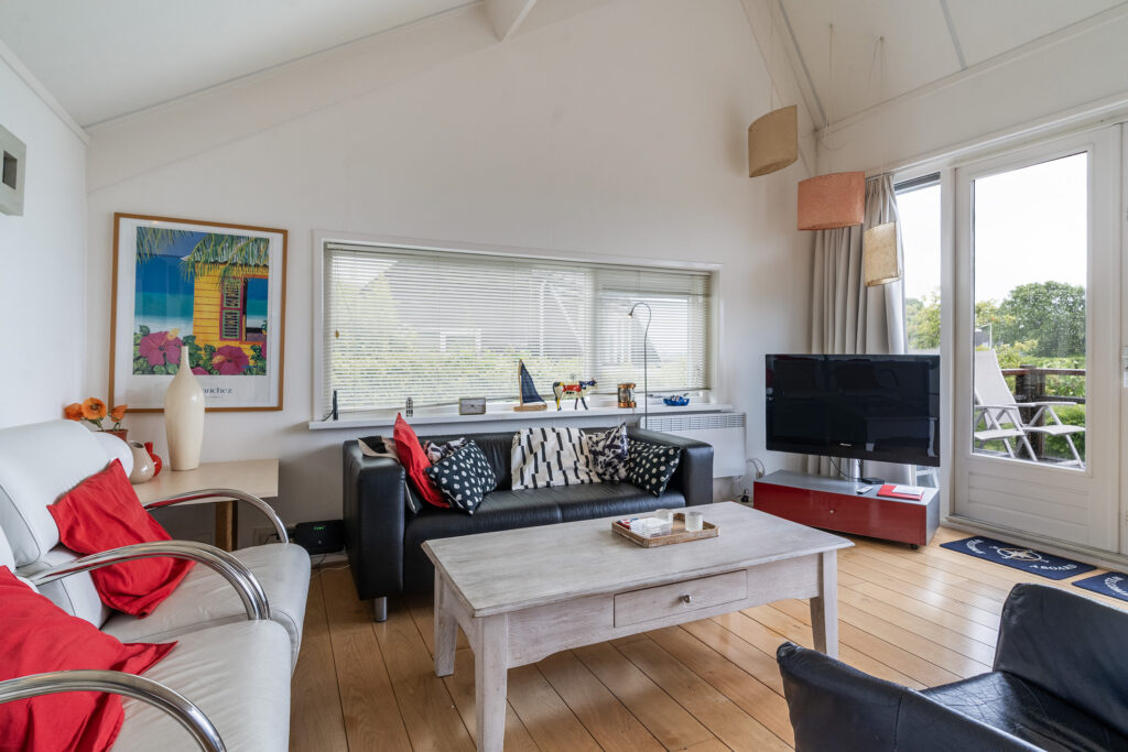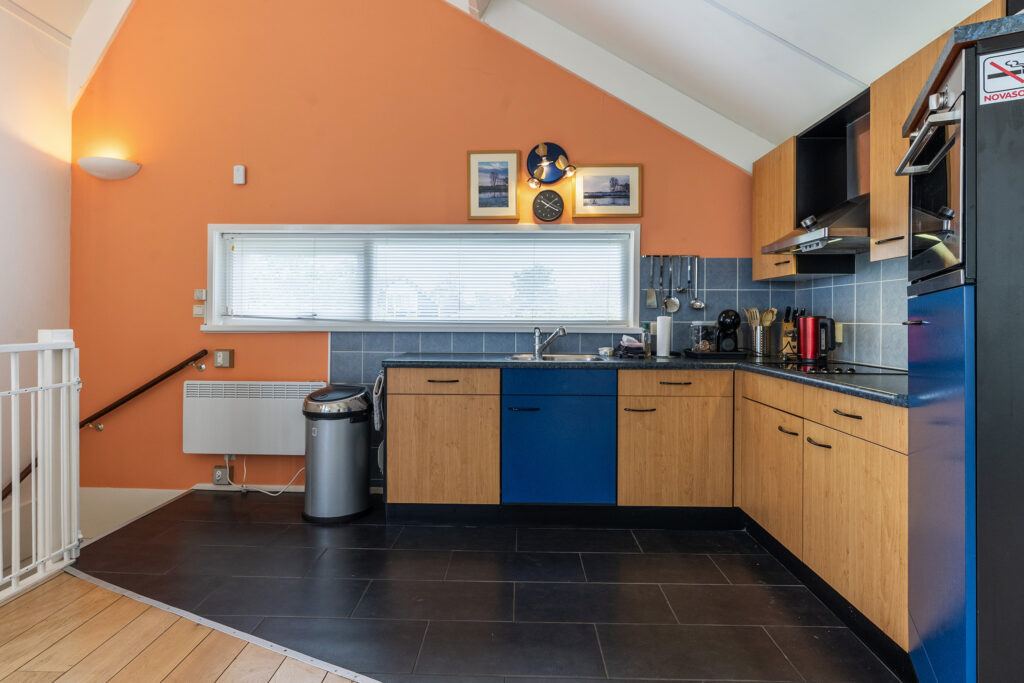 De vaste trap leidt naar de royale living met hoge plafonds en grote raampartijen, waardoor er veel licht binnenvalt en je een schitterend uitzicht hebt op de tuin en het water. De open hoekkeuken is uitgerust met een koelkast, inductiekookplaat en oven. De woonkamer biedt een aangename ruimte om te ontspannen of samen te komen met familie en vrienden.