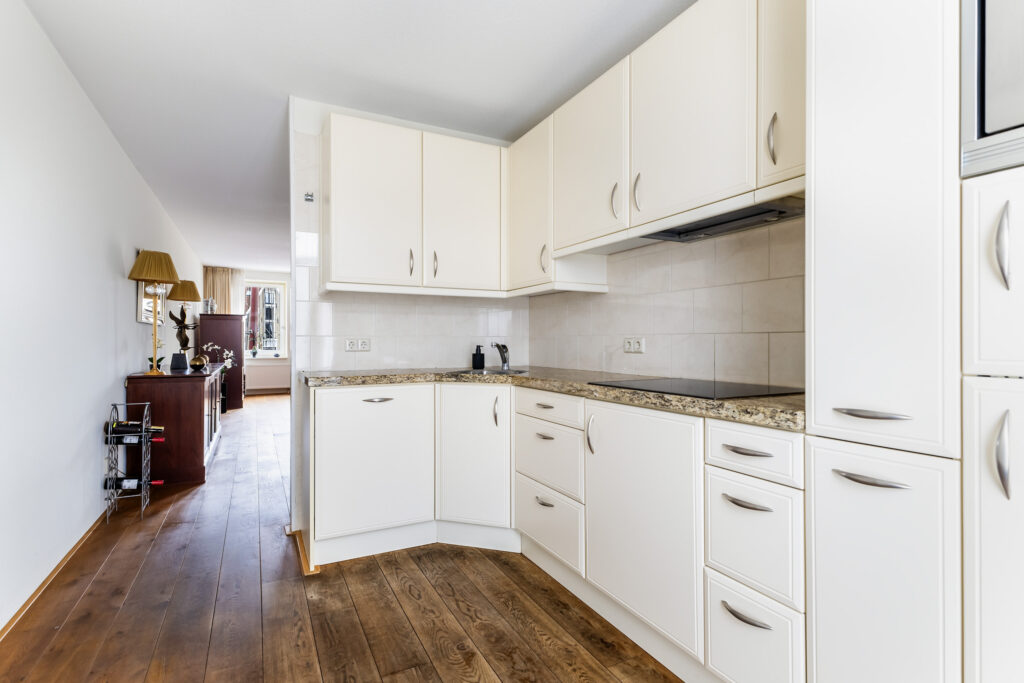 Hal/entree met meterkast, toilet en bijkeuken/wasruimte, ouderslaapkamer (ca. 15 m²) aan de waterzijde, 2e slaapkamer (ca. 8 m²), moderne/frisse badkamer v.v. ligbad, inloopdouche, 2e toilet en wastafel, erg ruime living (ca. 49 m²) met frans balkon, massief houten vloer en lage vensterbanken (zodat ook zittend van het altijd levendige uitzicht genoten kan worden), half open keuken (ca. 9 m²) met moderne keukenopstelling en toegang tot het zonnige balkon (ca. 7 m²).