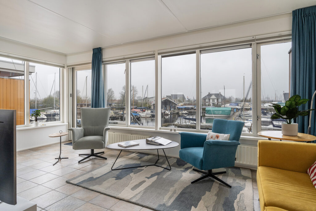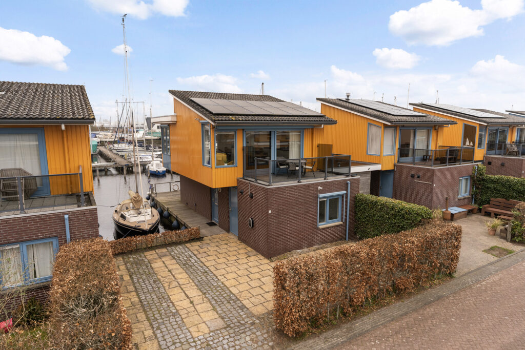 De woning is gebouwd in 1999 en kenmerkt zich door een eigentijdse, speelse architectuur met een robuuste bakstenen onderbouw en een opvallende opbouw in warme houttinten. Grote raampartijen zorgen voor een prachtige lichtinval en versterken de relatie met het omliggende waterlandschap. De verhoogde woonverdieping geeft de woning een bijzonder karakter en biedt een fraai uitzicht over de jachthaven. Vanuit de woonkamer bereikt u het op het zuiden gelegen dakterras, waar u in alle rust kunt genieten van de zon en het levendige uitzicht over het water. Een heerlijke plek om te ontspannen van ’s ochtends tot in de avonduren.