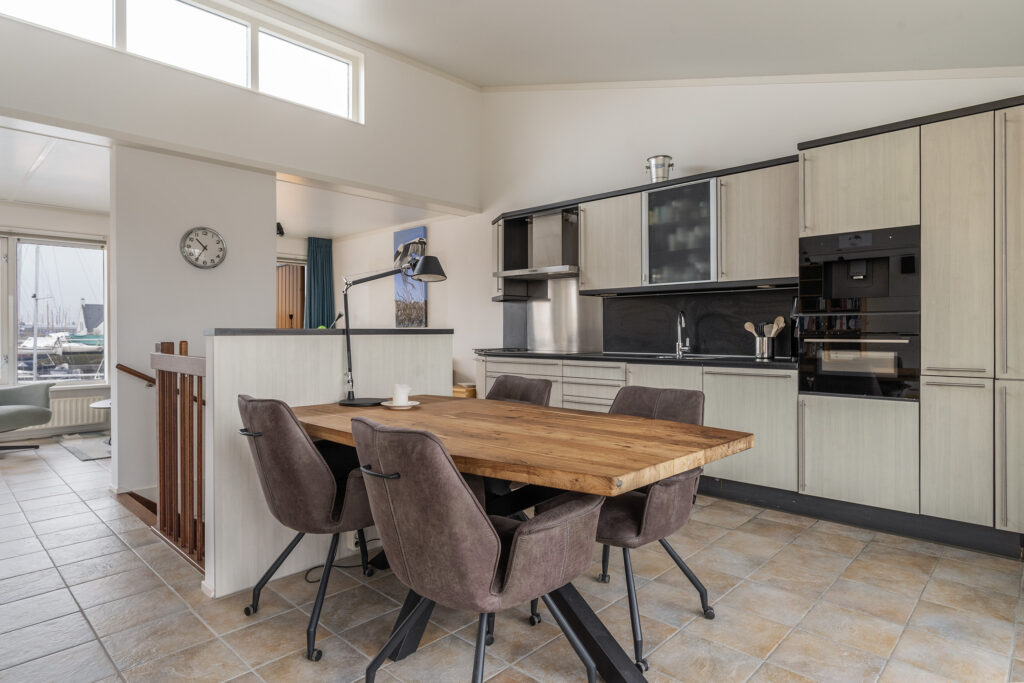 Via de trap bereikt u de royale en lichte woonkamer met een plafondhoogte circa 3,70 meter. Dankzij de grote raampartijen geniet u hier van een prachtig uitzicht over het water en de jachthaven. De open keuken is compleet uitgevoerd en sluit naadloos aan op de...