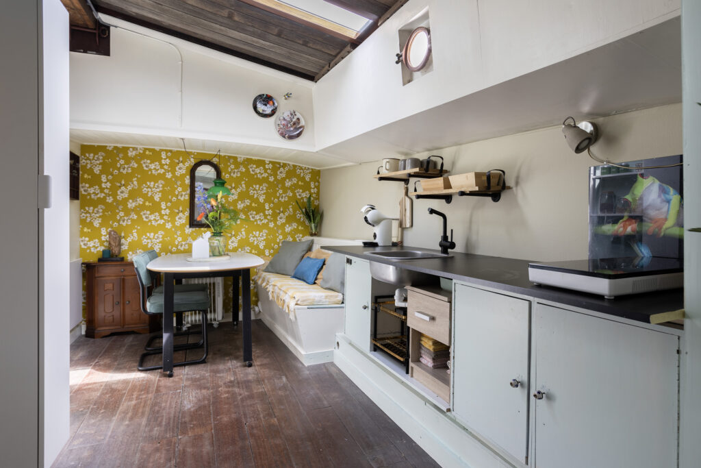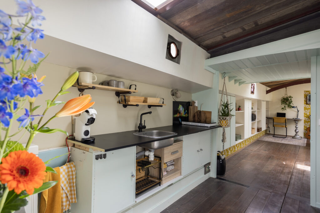 De open woonkeuken is functioneel ingericht en beschikt over een losse kookplaat, mengkraan, spoelbak en een charmant werkblad. Aan weerszijden van het schip bieden grote ingebouwde kastwanden verrassend veel opbergruimte. Aansluitend vindt je de bijkeuken met ruimte voor de witgoedcombinatie.