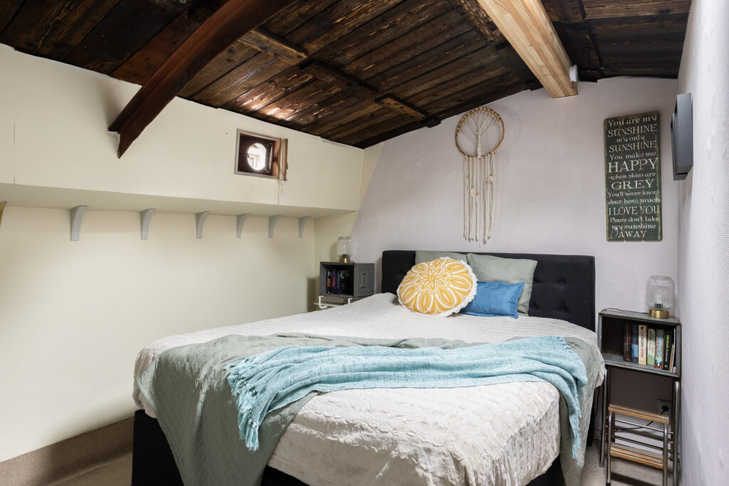 Eenmaal beneden bereik je via een hal – die dankzij een groot dakraam baadt in natuurlijk licht – de overige vertrekken. De hal geeft toegang tot de machinekamer, de slaapkamer van ca. 11 m², en leidt uiteindelijk naar de royale woonkamer (stahoogte 2,28m), het kloppende hart van het schip. Hier zorgen een gezellige palletkachel, houten betimmeringen en traditionele patrijspoorten voor een warme en authentieke sfeer.