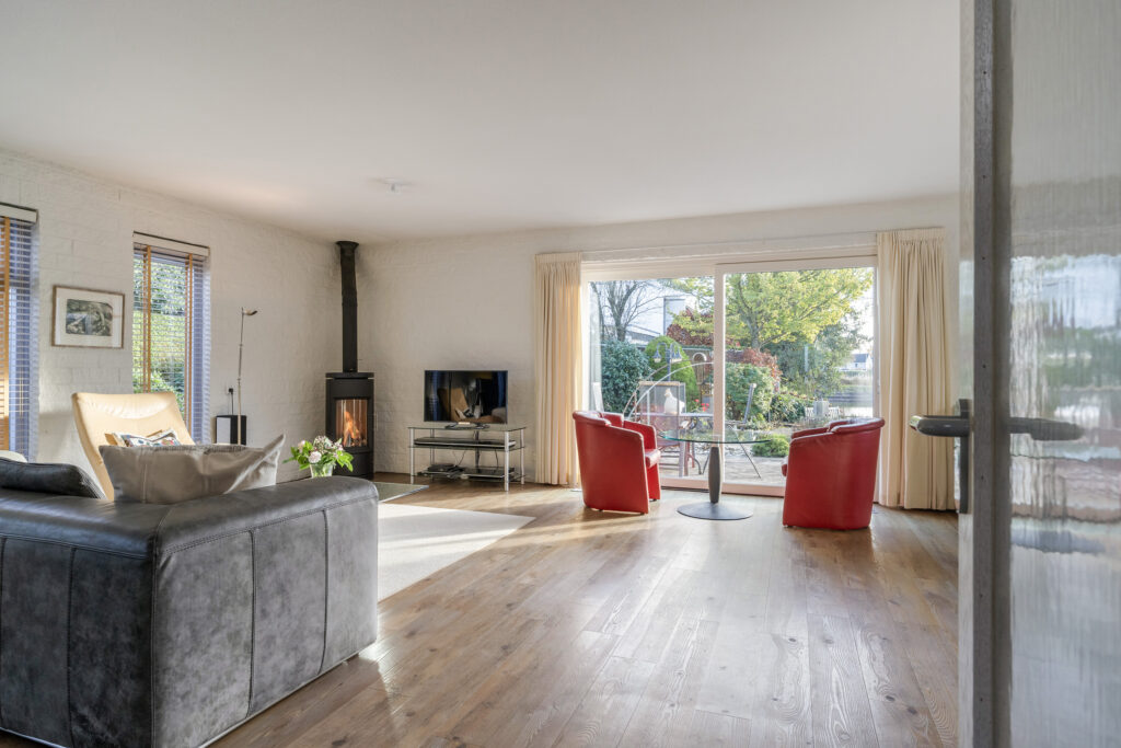 Aan het einde van de hal stap je de royale woonkamer met open keuken binnen: het hart van deze woning. Grote ramen en een schuifpui zorgen voor een overvloed aan licht en een prachtig vrij uitzicht over het water. De sfeervolle gashaard maakt het geheel compleet. De open keuken (1990) is praktisch ingericht en voorzien van diverse inbouwapparatuur. Door de speelse indeling voelt deze riante leefruimte tegelijkertijd warm en gezellig aan.