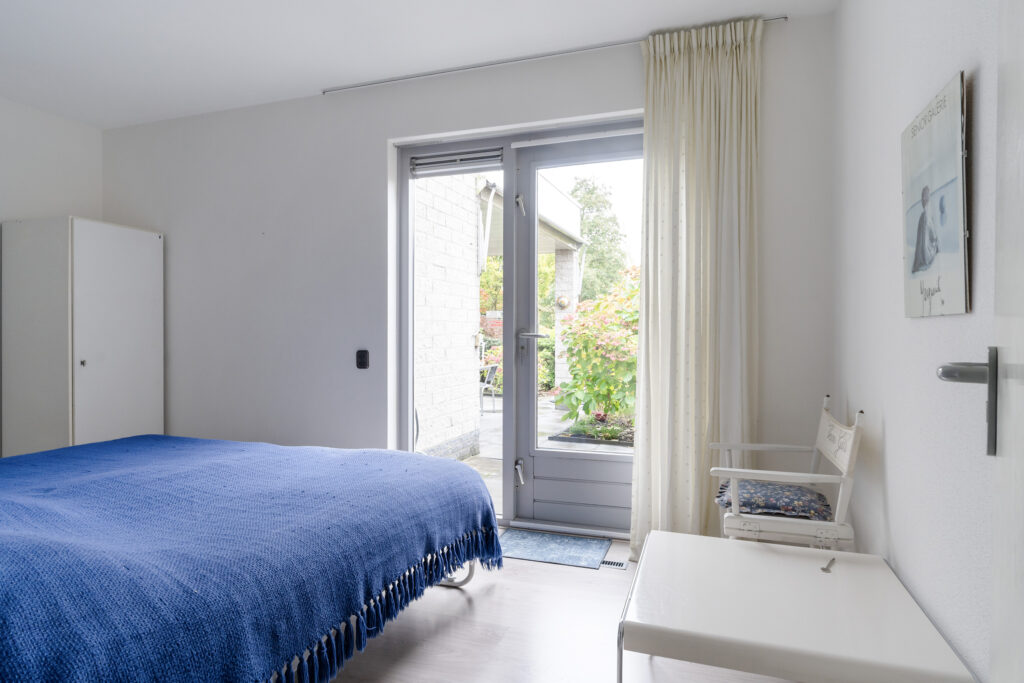 Aan de linkerzijde bevindt zich de eerste slaapkamer, gevolgd door een ruime badkamer met ligbad, douche, dubbele wastafel en bidet. Een deur verder is nog het separate toilet. Rechts vind je nog deuren naar de garage en de andere twee slaapkamers, beide met eigen deur naar de tuin, ideaal om op zonnige ochtenden direct naar buiten te stappen. Verder zijn er een wasruimte, tussenkamer waar een 2e badkamer van gemaakt kan worden en een technische ruimte met de installaties, waaronder de heteluchtverwarming en cv-ketel (beide van 2014).