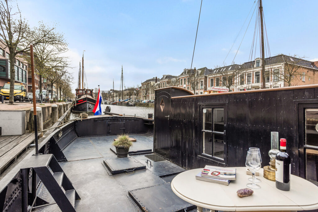 Buiten is er een grote ruime kuip waar je ideaal kunt zitten om te genieten van het mooie uitzicht op de grachtenpanden van Leeuwarden. Bij binnenkomst is er een klein toilet. Daarnaast is de keuken met een gaskookstel en granieten aanrechtblad met wasbak. Onder zit een koelkast en opbergkasten. Ik de keuken zit ook een vaste bank en tafel. Via een deur en een paar treden kom je vervolgens in de woonkamer/kantoor met daaraan grenzend 2 slaapkamers. De woonkamer kan naar eigen smaak worden ingericht. In de slaapkamers zitten vaste bedden van 2 meter lang. De stahoogte is 1,85 meter. Zie de plattegrond voor meer details.