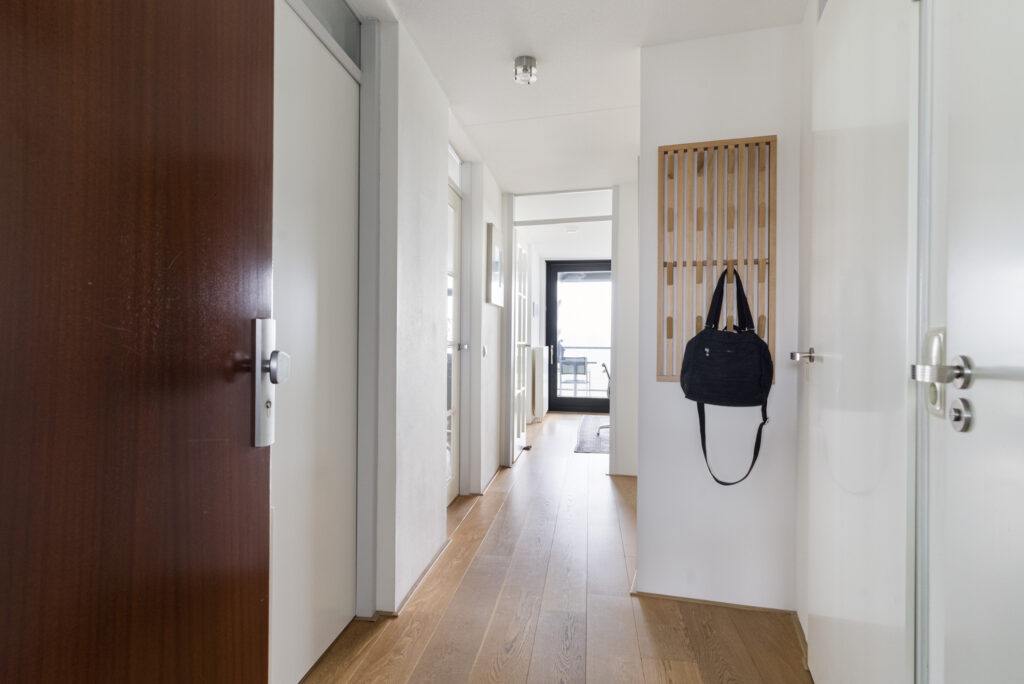 Hal/entree met toilet (wandcloset), bijkeuken/wasruimte, werkkamer/inloopkast (ca. 6,4 m²), gemoderniseerde badkamer v.v. toilet, dubbele wastafel en inloopdouche, 2 erg praktische slaapkamers (groot ca. 15 m² en 11 m²), zeer zonnige woonkamer (ca. 42 m²) met panoramisch uitzicht, open keuken v.v. moderne U-opstelling met veel inbouwapparatuur.