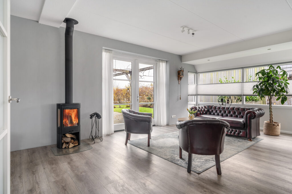 Begane grond: Royale hal/entree, toilet (hangcloset). De tuin- en watergerichte woonkamer (ca. 46 m²) is heerlijk breed opgezet, met grote raampartijen, tuindeuren en houtkachel.