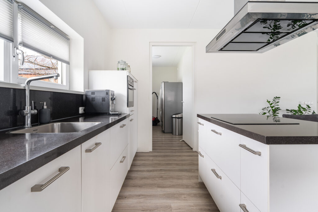 De moderne keuken is voorzien van kookeiland en diverse inbouwapparatuur. De aangrenzende bijkeuken met wasmachineaansluiting en extra bergruimte. Gelijkvloers wonen is hier een vanzelfsprekendheid. De ruime slaapkamer (ca. 15 m²) op de begane grond, met directe toegang tot de badkamer voorzien van 2e toilet, inloopdouche, dubbele wastafel (meubel), biedt ultiem comfort en maakt deze woning toekomstproof. De tussenhal biedt toegang tot de ruime (geïsoleerde) garage.