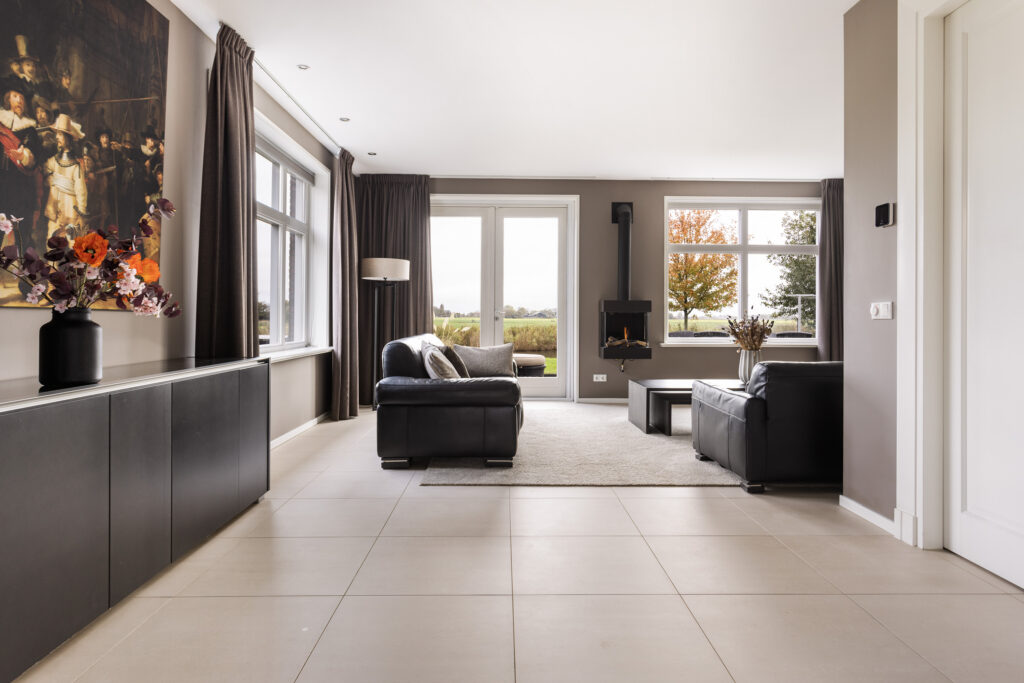 De lichte woonkamer, voorzien van vloerverwarming en Porcellenato tegels, is met en suite-deuren verdeeld in twee sfeervolle ruimtes, waar grote ramen zorgen voor een zee van daglicht en een prachtig uitzicht over de uitgestrekte landerijen van Wirdum en Swichum. Via de openslaande deuren stap je zo de ruime achtertuin van maar liefst 600 m² in, direct gelegen aan open vaarwater, ideaal voor een bootje of SUP.