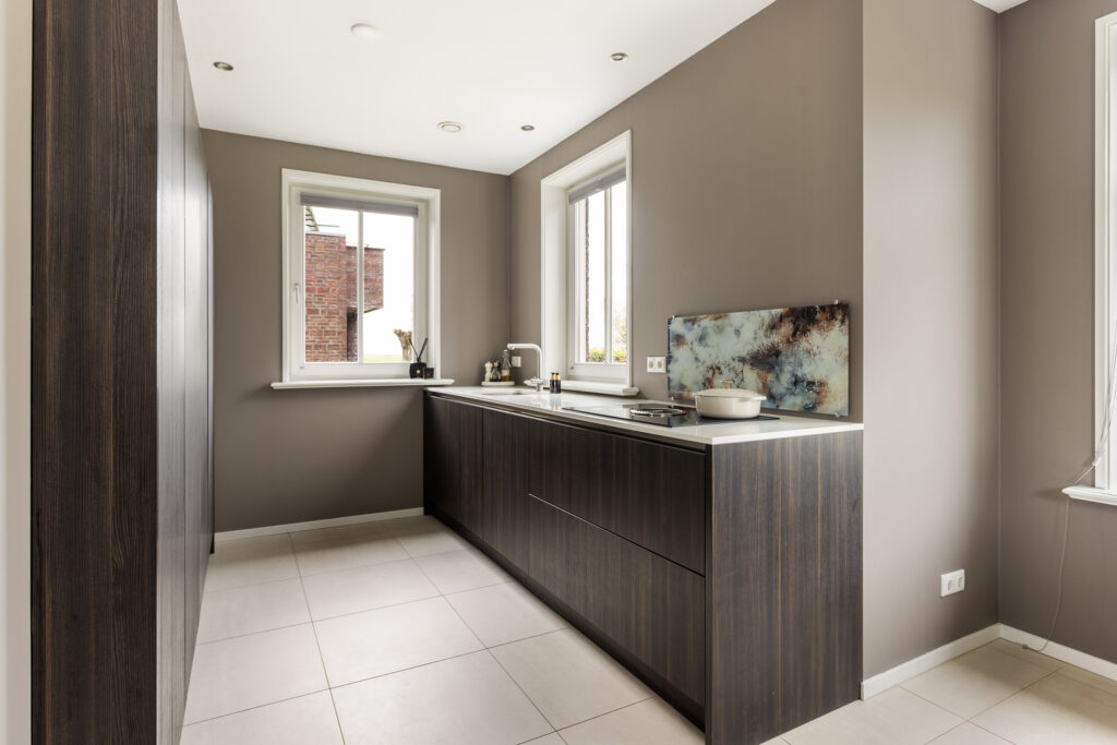 Aan de andere zijde vind je een stijlvol werkblad met geïntegreerde spoelbak, Quooker, vaatwasser en een inductiekookplaat met geïntegreerde afzuiging, een heerlijke plek om te koken, eten én te genieten.